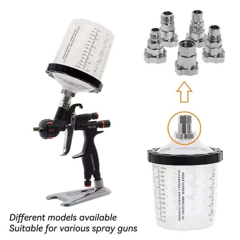 இந்த 400ML டிஸ்போசபிள் பெயிண்ட் கப் சிஸ்டம் 1.0 அடிப்படையில் பாரம்பரிய புவியீர்ப்பு கப்பை மாற்றுகிறது, ஏனெனில் இது அதிக பெயிண்ட்டை சேமிப்பது மட்டுமின்றி, ஓவியத்தின் செயல்திறனையும் மேம்படுத்துகிறது. குறிப்பாக, ஓவியம் வரையும்போது லைனரின் தானியங்கி சுழல் கீழே இருக்கும் நேர்த்தியான வடிவமைப்பு வண்ணப்பூச்சியை முழுமையாகப் பயன்படுத்துகிறது; இதற்கிடையில், விரைவான லாக்கிங் பிளஸ் லைனர் மாற்று வடிவமைப்பு கோப்பையை கழுவுவதைத் தவிர்க்கிறது, பெயிண்டிங் வேலையை திறமையாகவும் மீண்டும் மீண்டும் செய்யவும் அனுமதிக்கிறது. வெவ்வேறு ஸ்ப்ரே துப்பாக்கி ஆர்வலர்களின் அனுபவத் தேவைகளைப் பூர்த்தி செய்வதற்காக சந்தையில் கிட்டத்தட்ட அனைத்து பிராண்டுகளின் ஸ்ப்ரே துப்பாக்கிகளுக்கான அடாப்டர்கள் எங்களிடம் உள்ளன. அடாப்டர் துருப்பிடிக்காத எஃகு மூலம் தயாரிக்கப்படுகிறது, இது வண்ணப்பூச்சு அரிப்பை எதிர்க்கும் மற்றும் மிகவும் நீடித்தது. மூடியுடன் கூடிய லைனரின் இறுக்கமான கலவையானது, கப் சிஸ்டம் ஓவியம் வரையும்போது பெயிண்ட் கசியாமல் இருப்பதை உறுதி செய்கிறது, மேலும் கழிவுகளைத் தவிர்க்க பயன்படுத்தப்படாத வண்ணப்பூச்சின் நீண்ட கால சேமிப்பை ஆதரிக்கிறது.