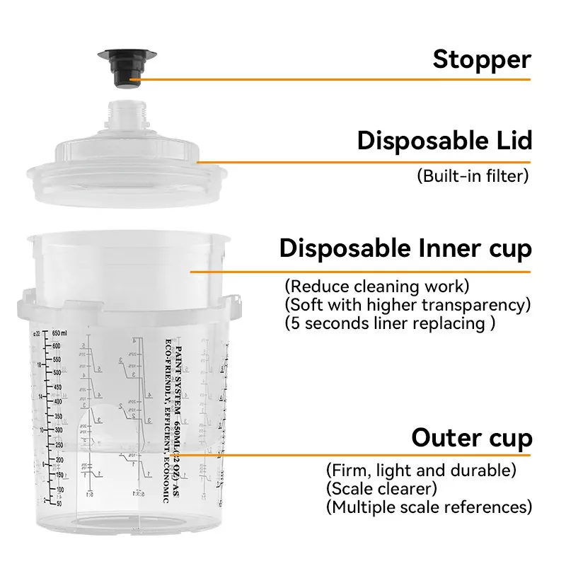 கடினமான கோப்பையில் உள்ள கட்-அவுட் சாளரம் எந்த நேரத்திலும் வண்ணப்பூச்சு அளவை எளிதாகக் கண்காணிக்க உங்களை அனுமதிக்கிறது, மேலும் வண்ணப்பூச்சு நிரப்பும் போது அல்லது டின்டிங் செய்யும் போது கோப்பையின் உடலின் வழியாக லைனரைப் புரிந்துகொள்வதன் மூலம் கோப்பை மூடியை எளிதாக அகற்றலாம்.