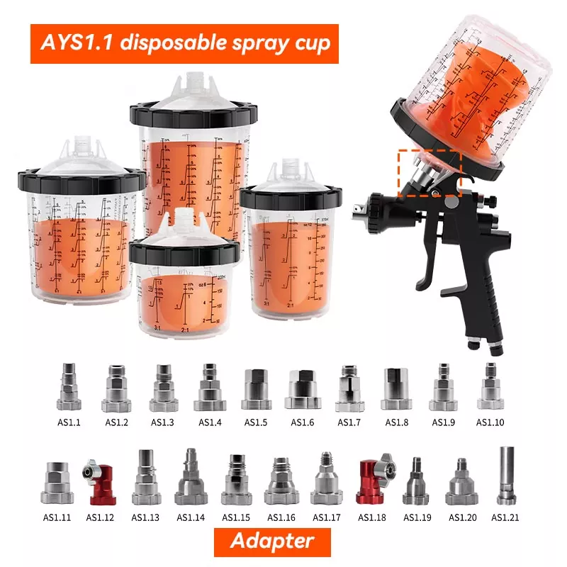 AYS1.1 டிஸ்போசபிள் ஸ்ப்ரே கப் PPS1.0 தொடர் அடாப்டருடன் இணக்கமானது. அடாப்டருடன், ஸ்ப்ரே துப்பாக்கியின் எந்த பிராண்டிற்கும் சரியாகத் தழுவி, வண்ணப்பூச்சு சொட்டுவதற்கான ஆபத்து இல்லாமல் எந்த நிலையிலும் பயன்படுத்தலாம்.