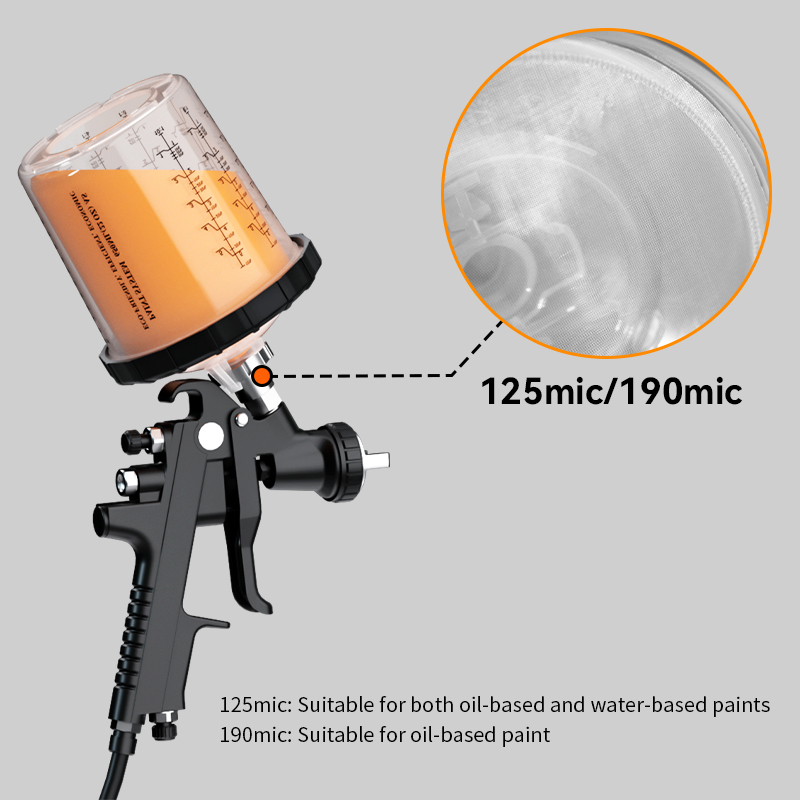 • சிறந்த பெயிண்ட் பூச்சுக்கான உள்ளமைக்கப்பட்ட ஒருங்கிணைந்த வடிப்பான்கள்: டிஸ்போசபிள் ஸ்ப்ரே கப் தொப்பியில் உள்ளமைக்கப்பட்ட 190μ (எண்ணெய் அடிப்படையிலான பெயிண்ட்) மற்றும் 125μ (நீர் சார்ந்த வண்ணப்பூச்சு) வடிகட்டிகள் உள்ளன, தெளிக்கும் போது அசுத்தங்களை திறம்பட வடிகட்டுகிறது மற்றும் பெயிண்ட் பளபளப்பை 20% அதிகரிக்கிறது.