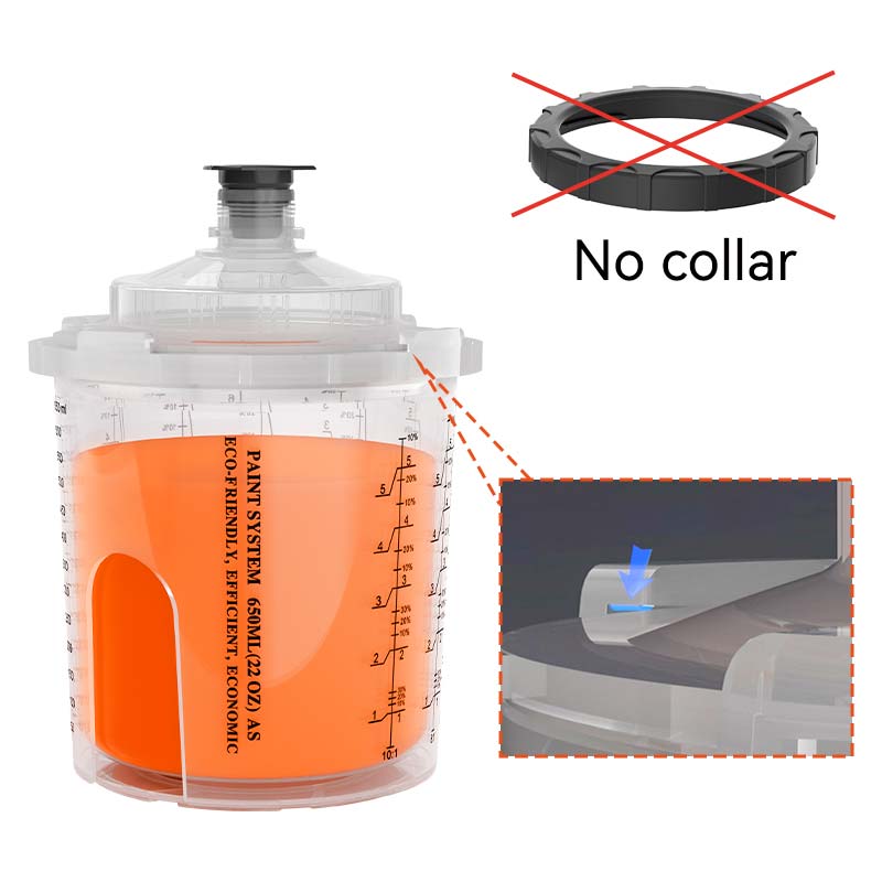 கோப்பைக்கும் மூடியுக்கும் இடையில் இறுக்கமான இணைப்பை உருவாக்கும் காலர், செலவழிப்பு தெளிப்பு கோப்பை அமைப்புகளில் நீண்ட காலமாக ஒரு முக்கிய அங்கமாக உள்ளது. பிஸியான ஓவியம் அமர்வுகளின் போது, ஓவியர்கள் பெரும்பாலும் காலரை இழக்கிறார்கள் அல்லது சேதப்படுத்துகிறார்கள், செலவழிப்பு தெளிப்பு கோப்பை சரியாக செயல்படுவதைத் தடுக்கிறார்கள், குறிப்பிடத்தக்க சவால்களை உருவாக்குகிறார்கள்.